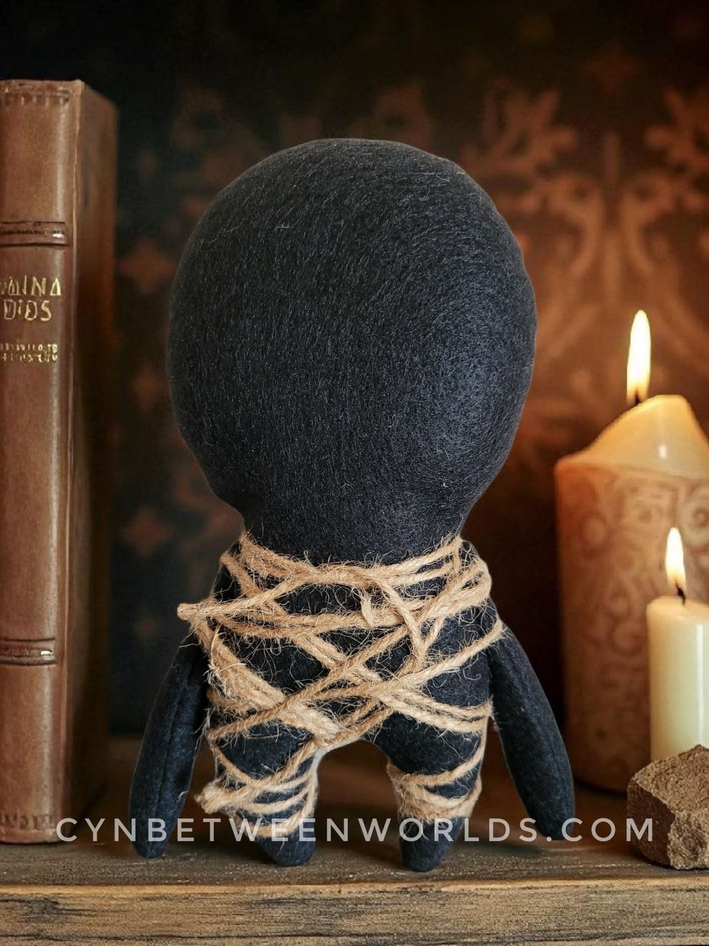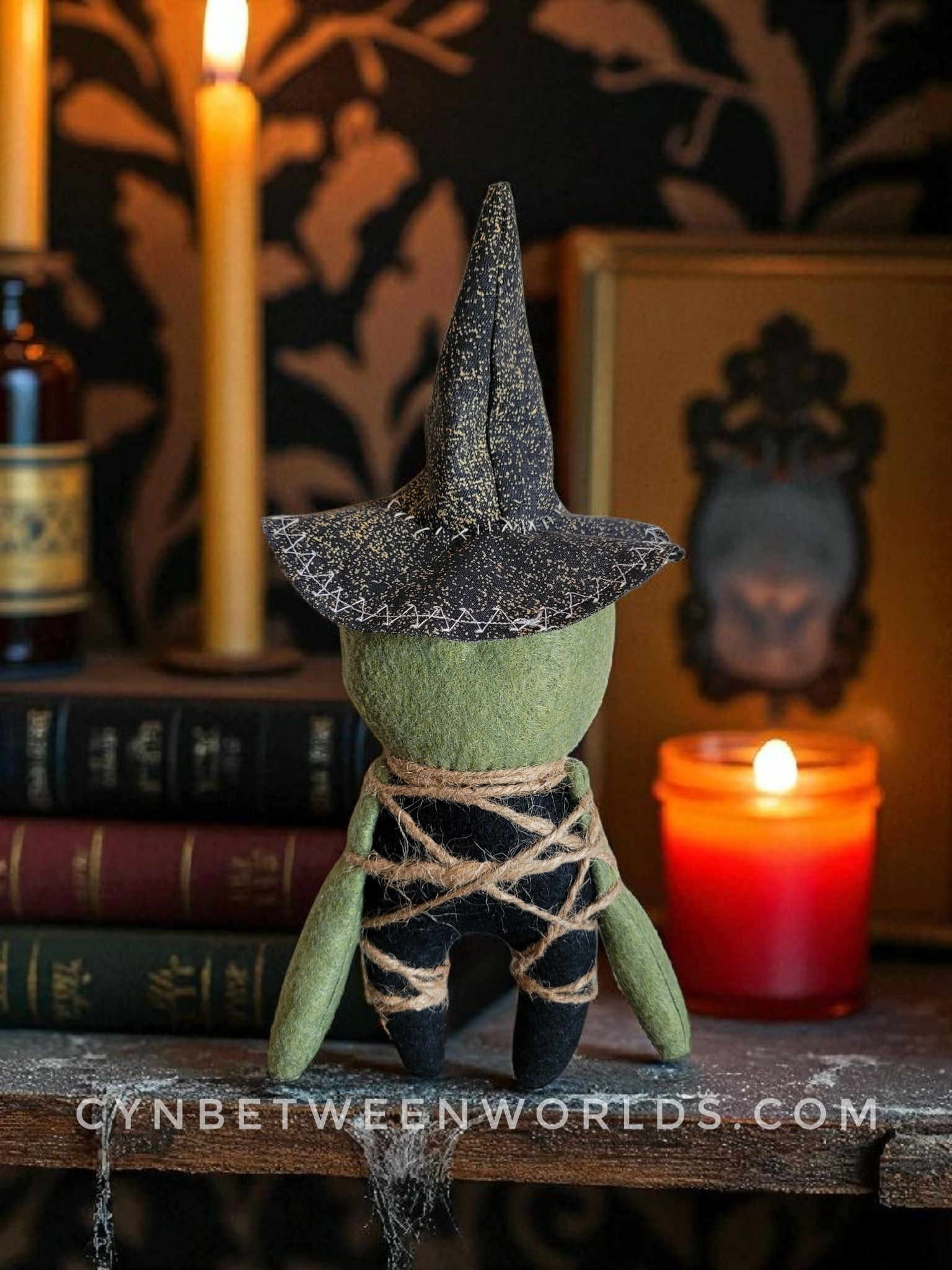 Taller than her companions thanks to her hat (around 10.5" total height), this little spell-slinger is wrapped in twine and spells trouble. Her shadowy expression, button eyes, and “HEX” tile charm suggest she’s been brewing mischief for centuries—and now she’s found you.
