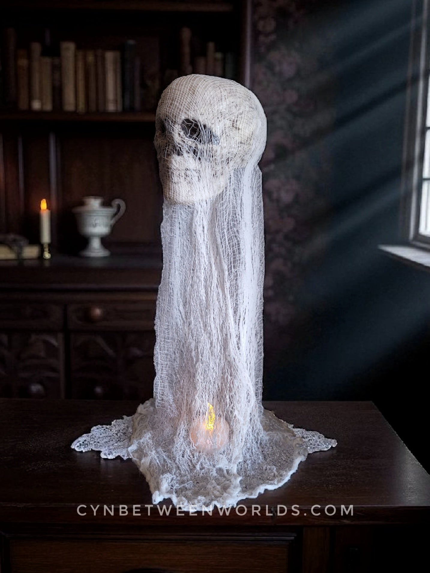 12.5" Handmade Floating Skull Ghost – Gothic Decor with Flickering Tea Light