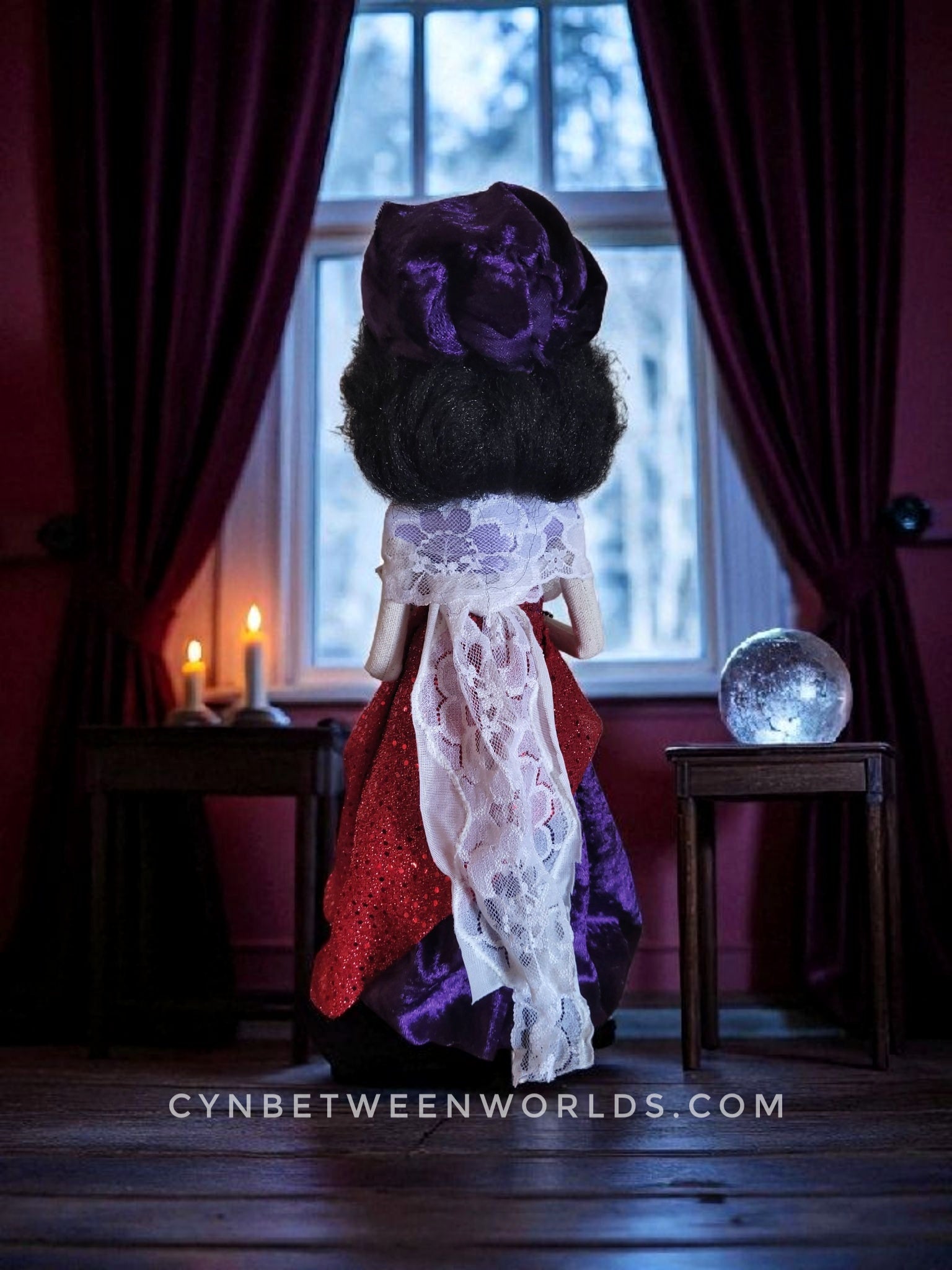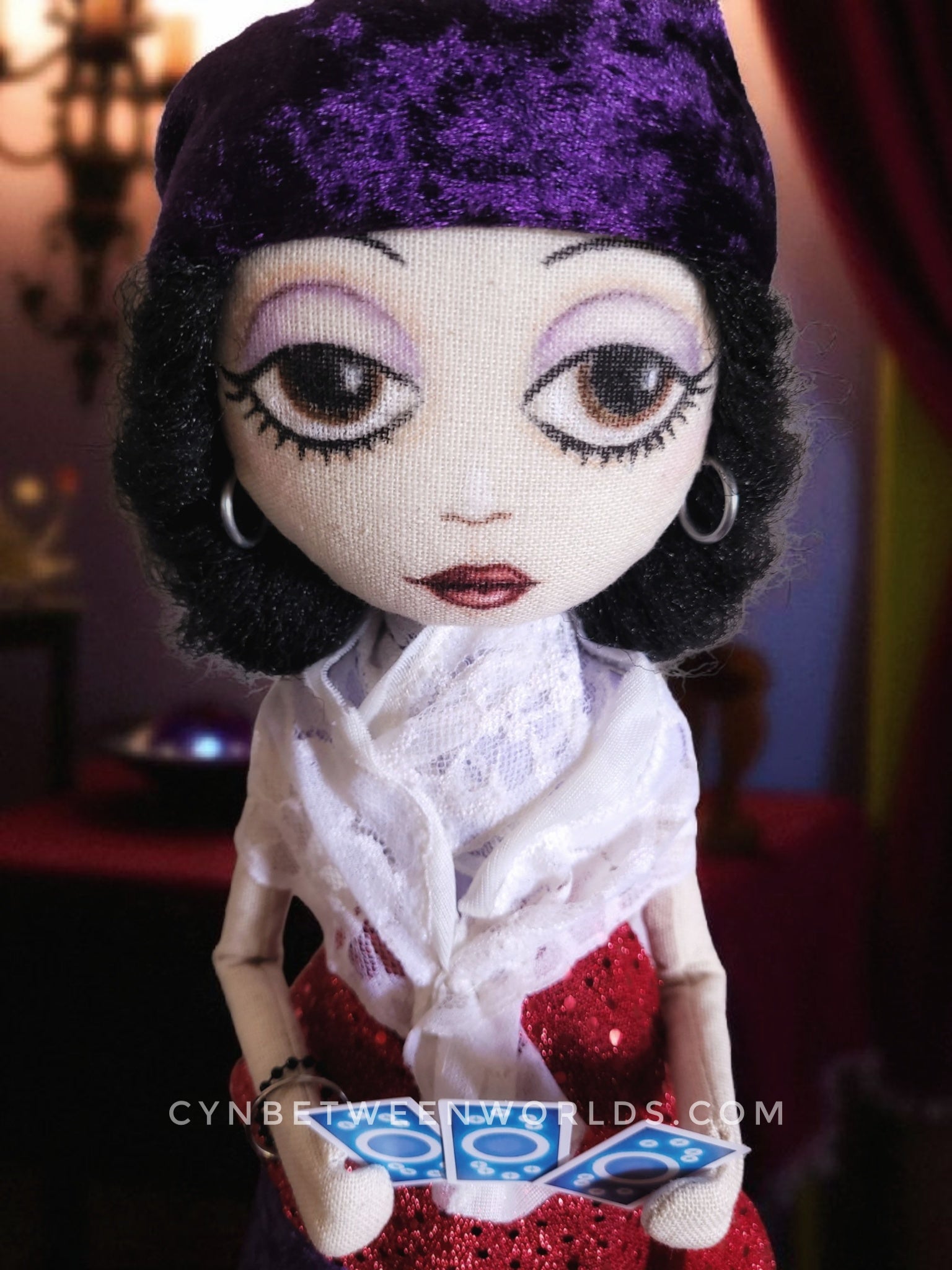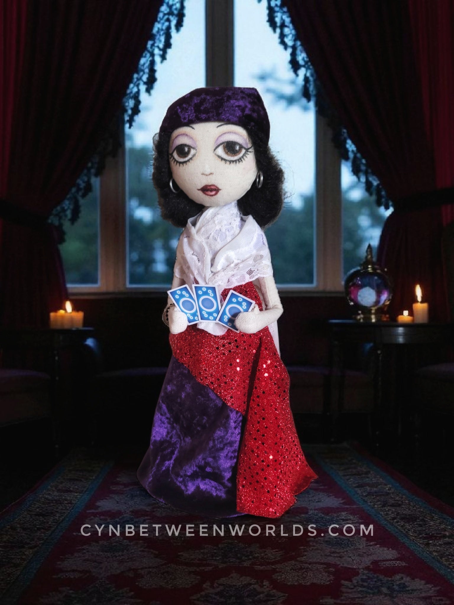 She is dressed in deep purple velvet, layered with lace and a glittering red sash, and crowned with a velvet headscarf. In her hands, she holds three miniature tarot cards, chosen randomly. Will they cause clarity or chaos? Only you'll know when you take her home.
