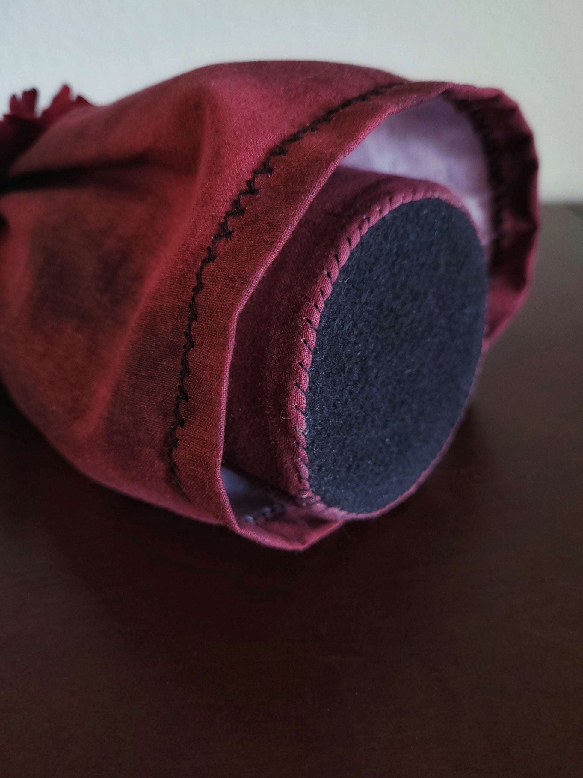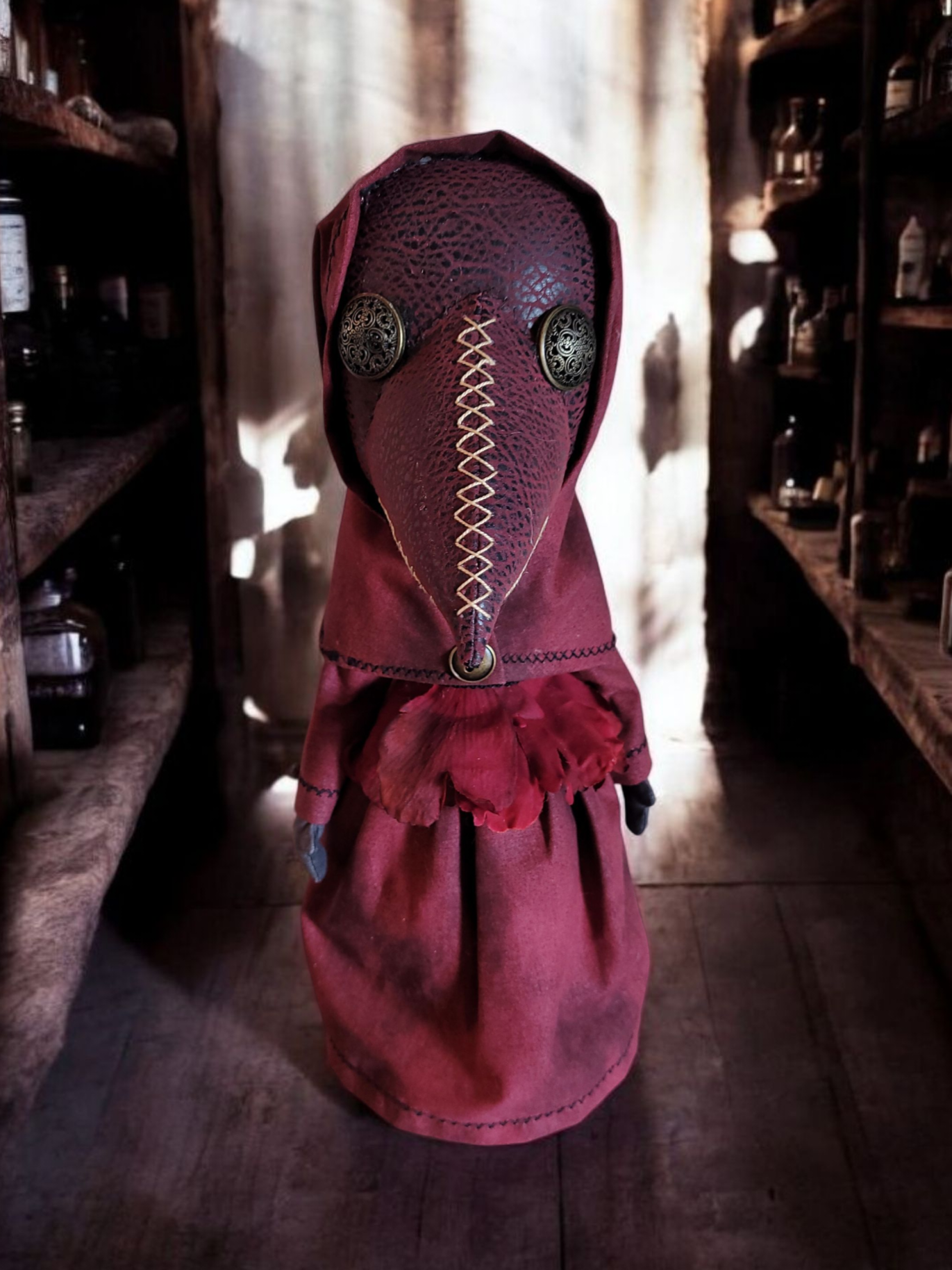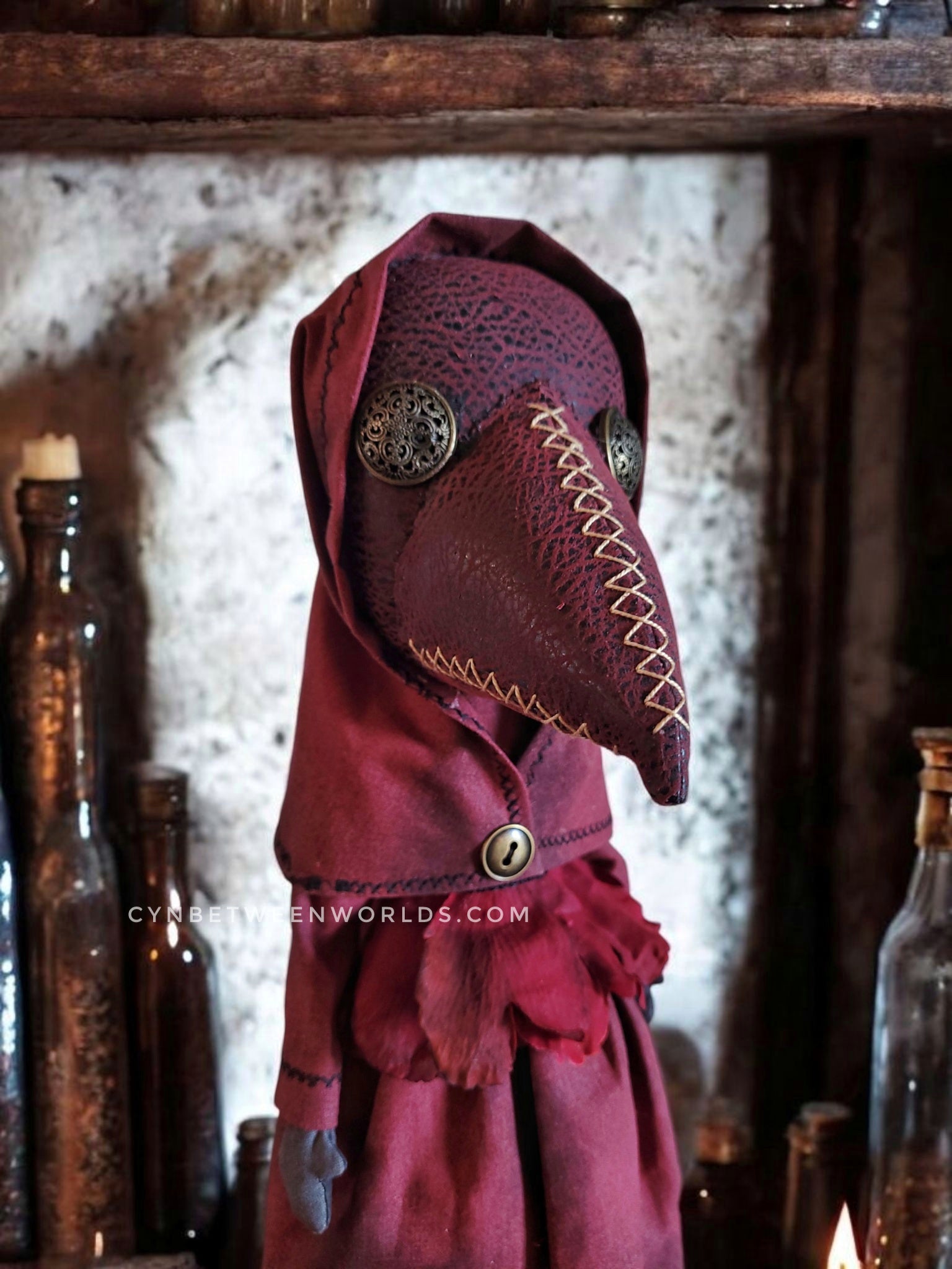 This solemn soul steps straight out of a fever dream—cloaked in deep burgundy, with an ominous beaked mask stitched in faux leather and fixed in place beneath a stitched hood. Her body is vase-shaped for ease of standing, and her face features antique-style metal accents for eyes. Dark red faux flower pedals accent her waist, and adds a bit of whimsy to an otherwise somber appearance. She's a one-of-a-kind doll, handmade with care.