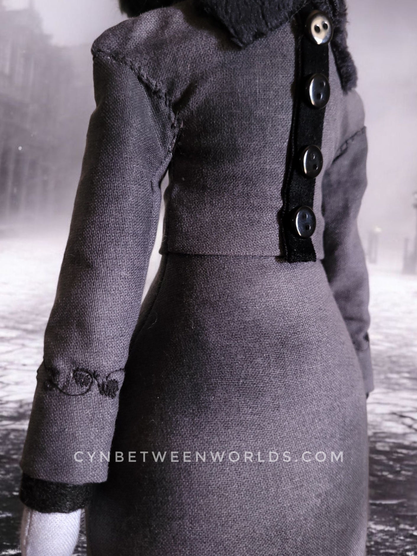 This posh zombie doll looks like she just stepped out of a haunted Edwardian nursery—then promptly devoured the nanny. Handcrafted with detail, she stands approximately 15" tall. Her slender, sculpted body is clothed in a tailored grey dress with black accents and a plush velvet collar. Her face features hand-painted undead details: grinning red gums and skeletal teeth.