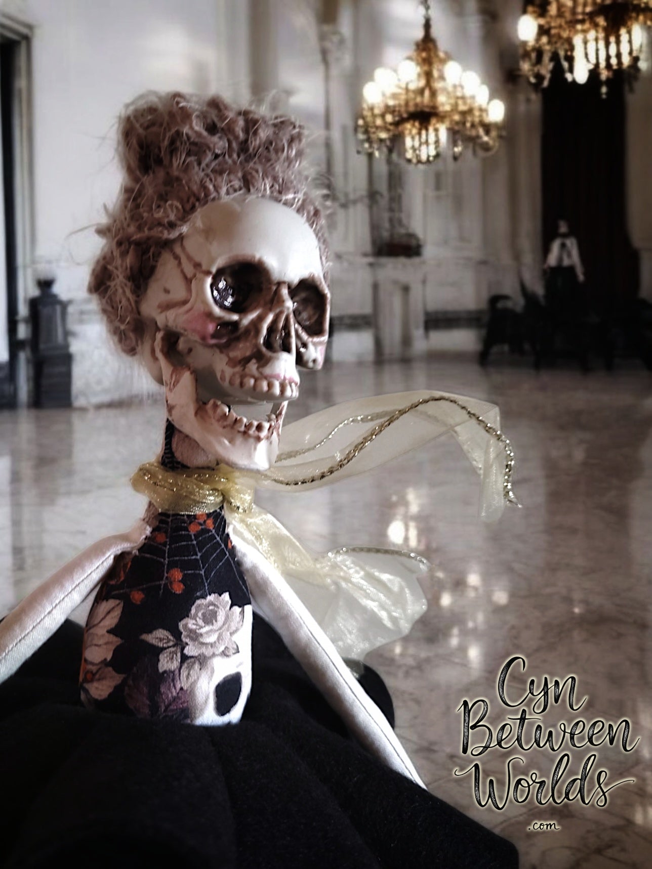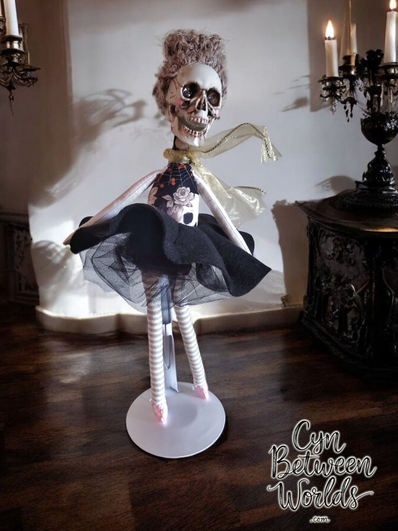 This one-of-a-kind dancing skeleton stands at approximately 16" tall, with a lightweight resin skull that gives her a beautifully eerie expression. Her body, made entirely by hand, features a dark floral and spiderweb bodice and soft, striped legs ending in pink ballet-style slippers. Her skirt is layered with black felt and netting that gives just the right amount of flair when she twirls. A sheer gold ribbon wraps around her neck like a ghost of elegance, and her fluffy updo adds a hint of Victorian drama. She balances gracefully (with the help of a doll stand), and looks ready to dance through whatever strange twilight ballroom you place her in.