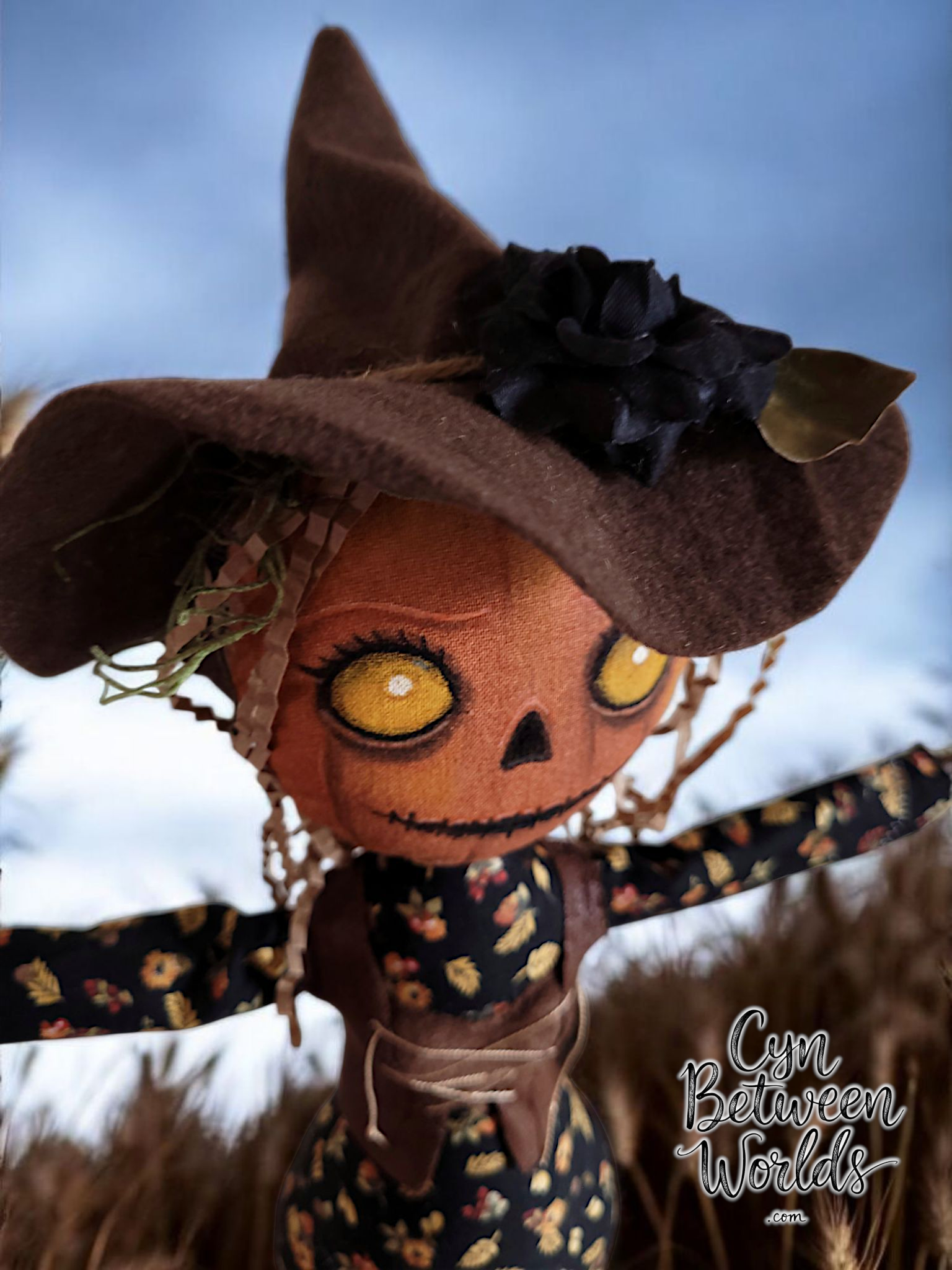 She wears a floral autumn dress, with a bustier over the top, paired with a crinkled felt hat (permanently attached), and has textured hair made from shredded paper and bits of dried moss. Her arms are made from natural sticks and are fixed in an outstretched position—like she’s been standing guard in a forgotten field just a bit too long.