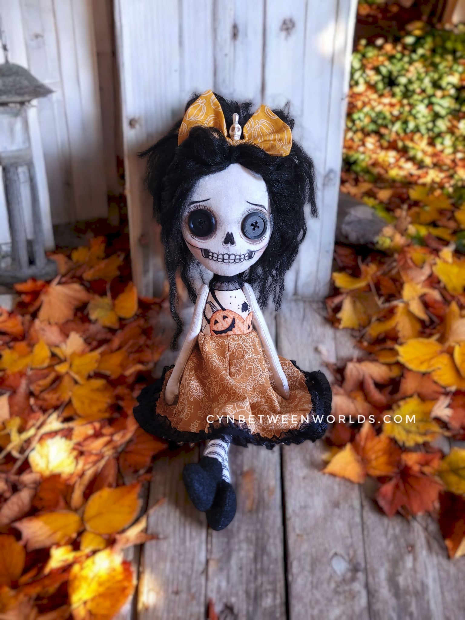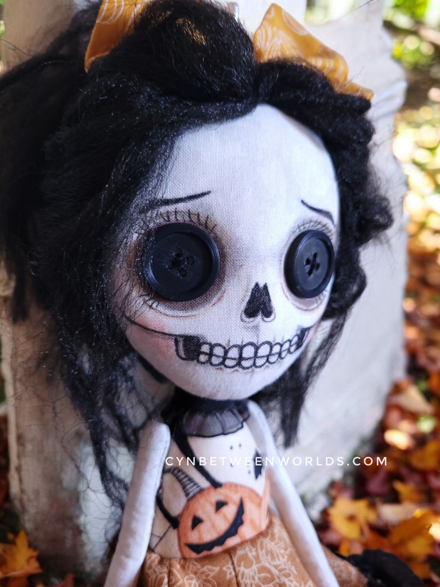 This one-of-a-kind doll features a hand-drawn skull face, brought to life with inks and paint, and accented with expressive button eyes. Her hair is made from textured acrylic yarn—slightly wild, delightfully wiry, and full of personality. She wears a cheerful autumn dress with floral details, lace trim, and pumpkin accents. Topping it off is a handmade bow nestled in her tousled black hair. It is pinned into place, making it movable.