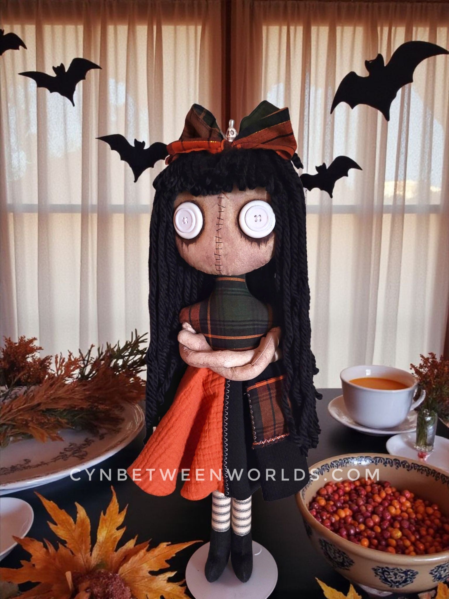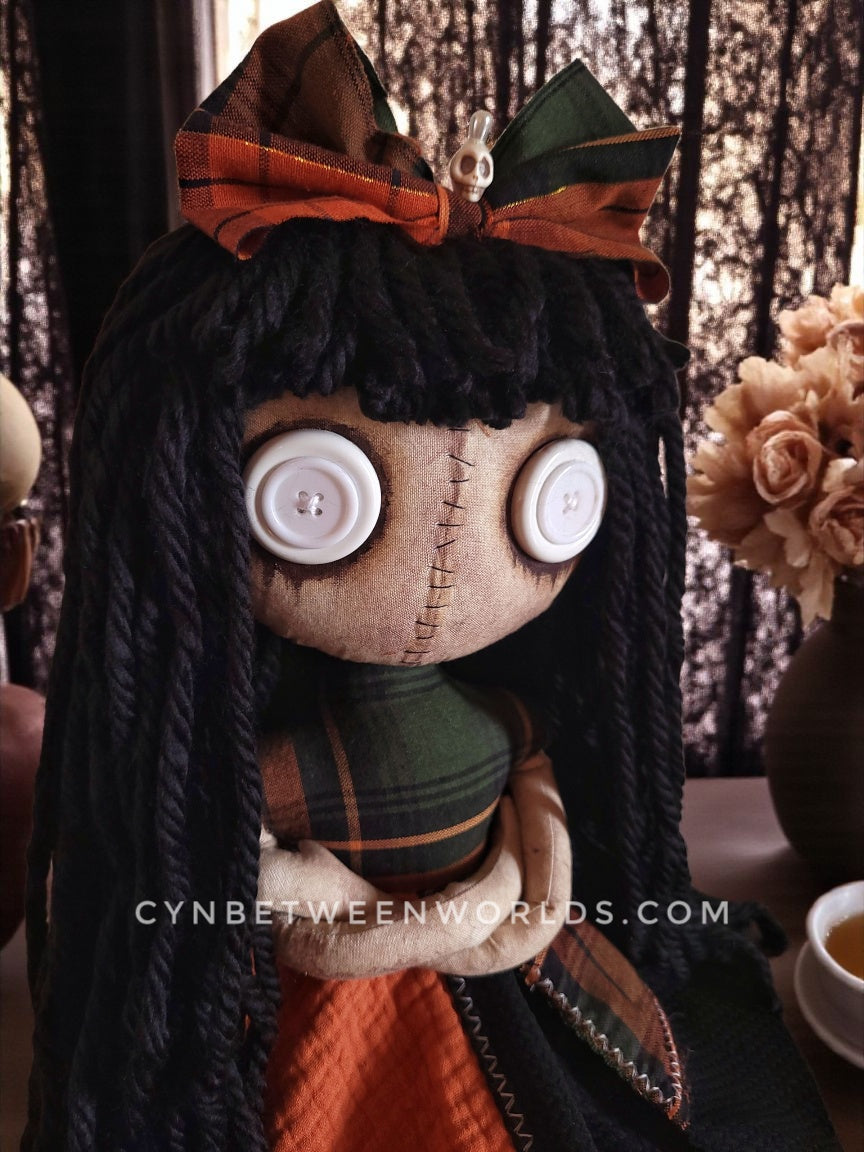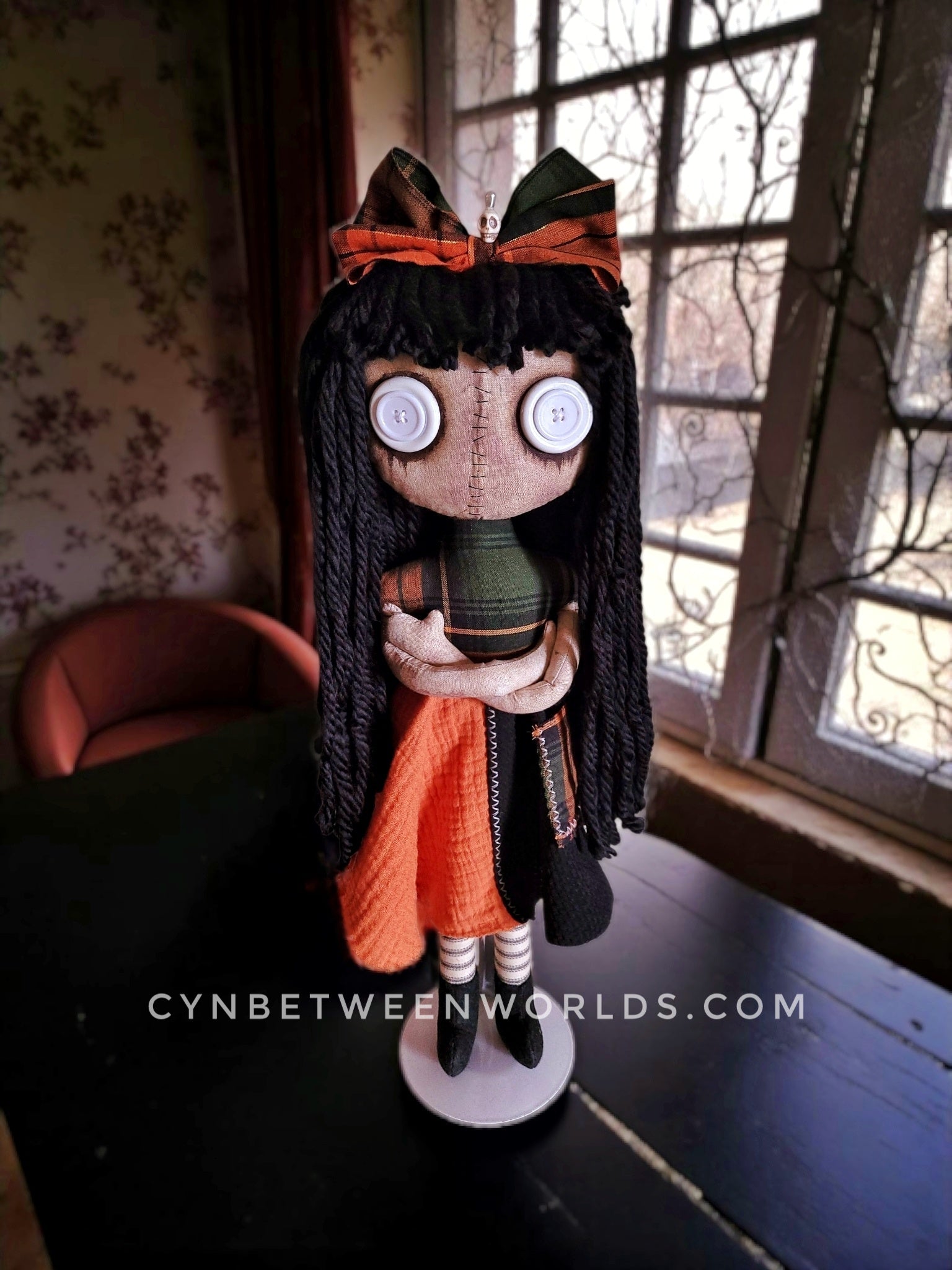 This handmade gothic ragdoll stands 19" tall (a bit more with her bow). Her distressed stitched face is accented with oversized white button eyes and a seam running diagonally down her features, giving her that perfectly spooky stitched-back-together look. She wears a dress in warm autumn tones of plaid, orange gauze, and black, with a little stitched pocket on her skirt. Her long black yarn hair is styled straight, topped with a plaid bow for a finishing touch. She stands upright on a doll stand (not included), striped stockings peeking out from under her hem, and black felt boots completing her look. A mix of cute, eerie, and handmade charm—she’s a stitched companion, and wholly unique.