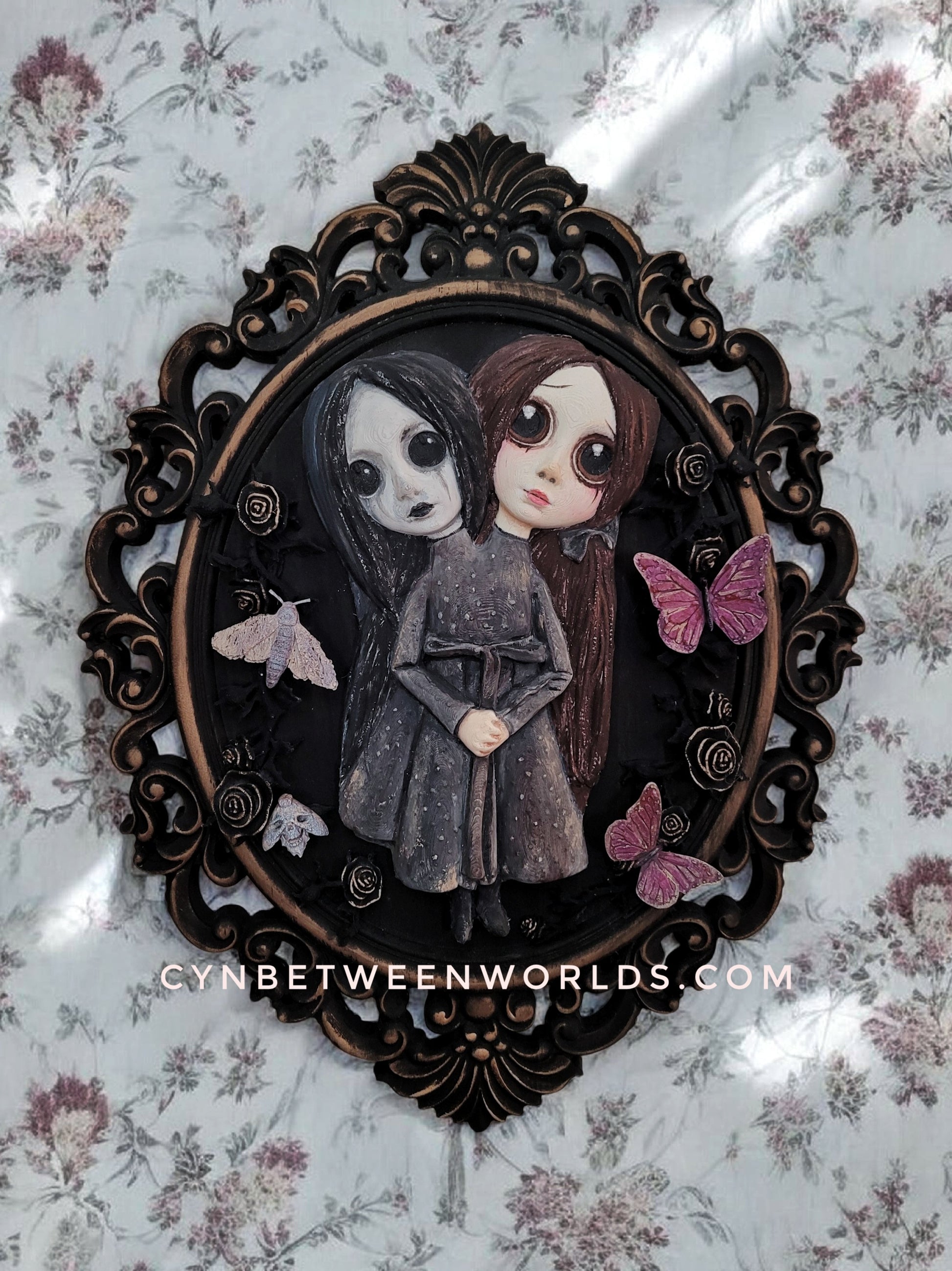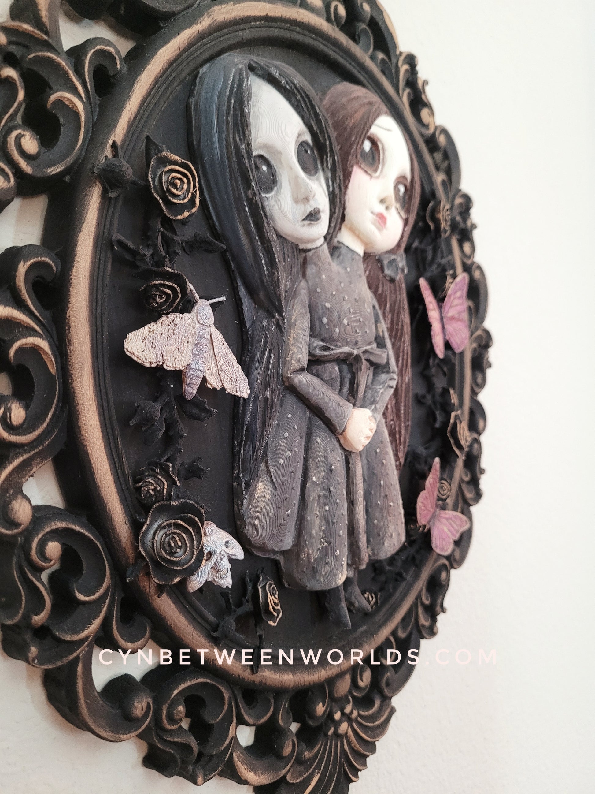 This sculptural wall relief is based on a hand-made doll I created a couple years ago and have always wanted to revisit. The piece features two sisters sharing a single body — one pale and shadowed, the other warm and melancholy — surrounded by small moths, butterflies, vines and roses.